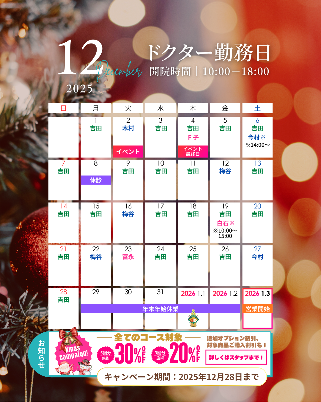 12月のドクター勤務スケジュールをお知らせいたします。