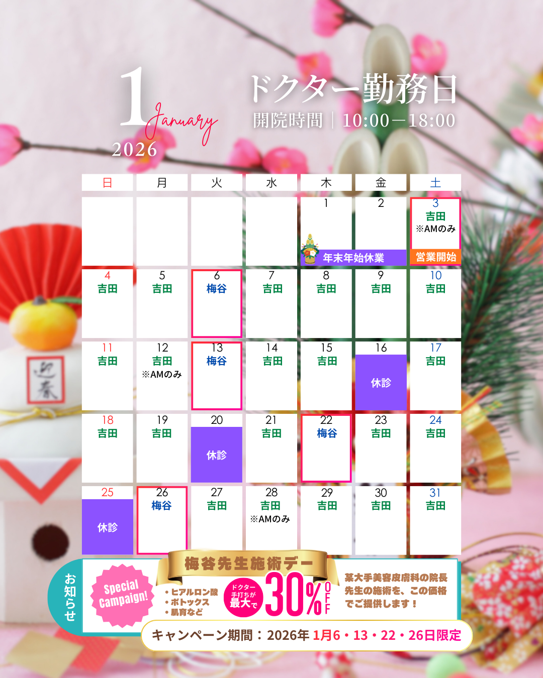 1月中は対象ドクター出勤日に、ドクター手打ちが最大30%OFFになるスペシャルキャンペーンを開催致します。