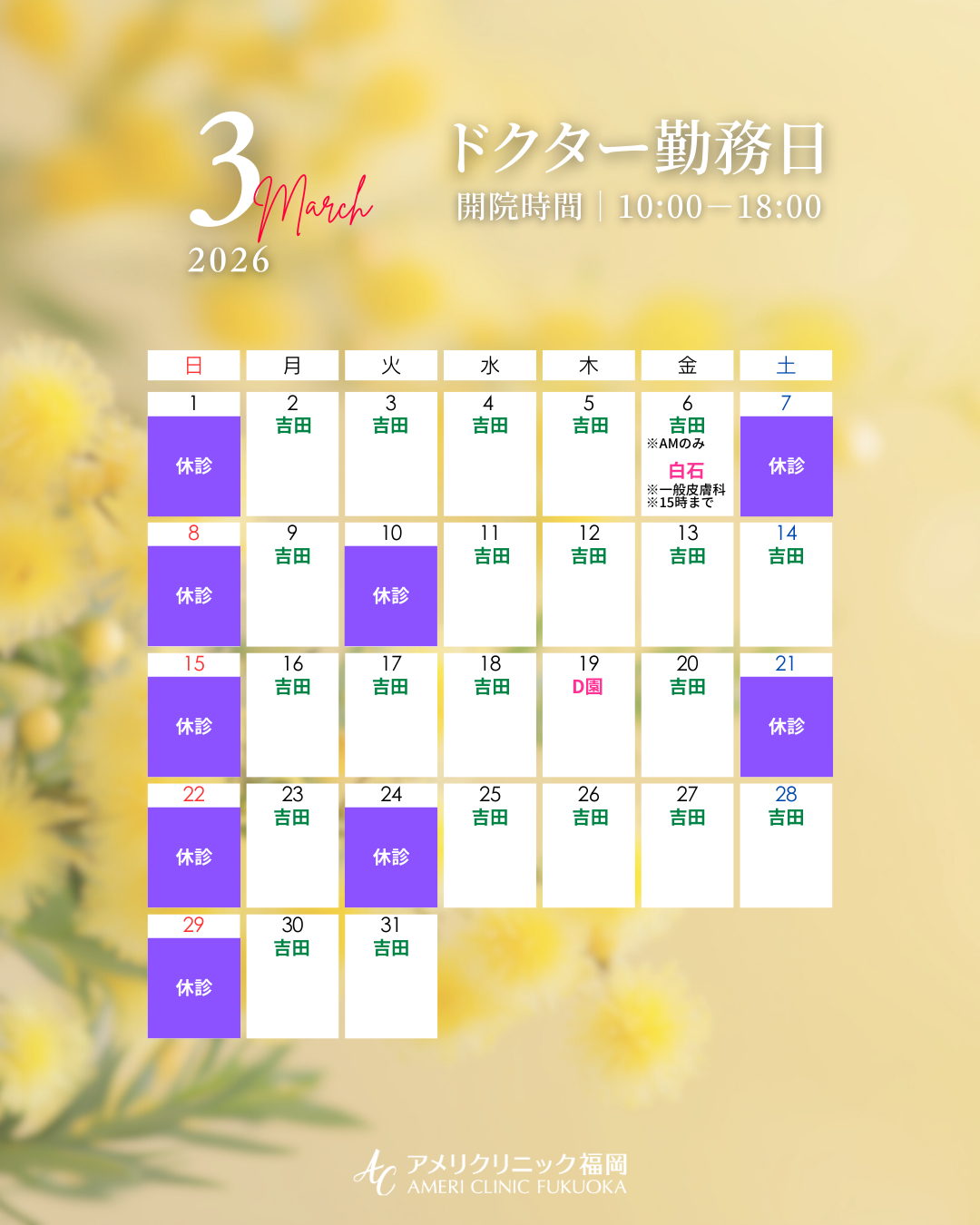 2026年3月ドクタースケジュール 2026.02.26 NEWS 3月のカレンダーです。ご予約をお取りになる際に参考にされてください🌼 D園先生勤務日:19日白石先生:6日(15時まで)となっております。※休診日・ドクター勤務日等は予告なく変更となる場合がございます。ご了承ください。 画像をクリックすることで拡大表示されます ご予約は、HP、公式LINEから受け付け中‼️ご予約お待ちしております🙇♀️ ご予約はこちらから!! Post Share Line RSS Pin it note クチコミ割キャンペーン 前の記事 ✨3月限定✨ \輝く光肌キャンペーン/ 次の記事