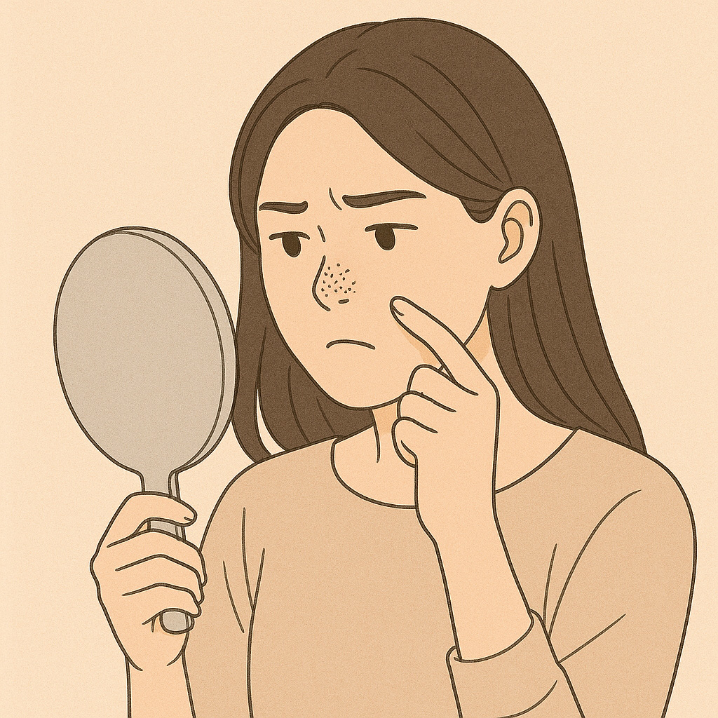 毛穴に詰まった皮脂や古い角質(角栓)は、空気に触れると酸化し、黒ずんで見えます。いわゆる「いちご鼻」はこの状態。また、酸化した皮脂は炎症を引き起こしやすく、ニキビや赤みの原因にもつながります。