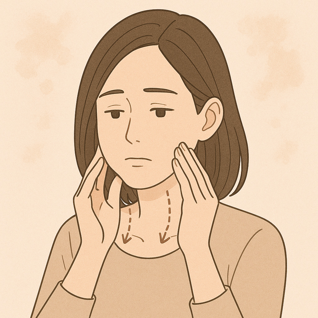 表情筋(特に頬を支える筋肉)が使われにくくなると、筋肉が萎縮して皮膚や脂肪を支えられなくなります。一方で、眉間や口元など使いすぎる筋肉とのバランスも崩れ、顔全体のたるみ印象が強まります。