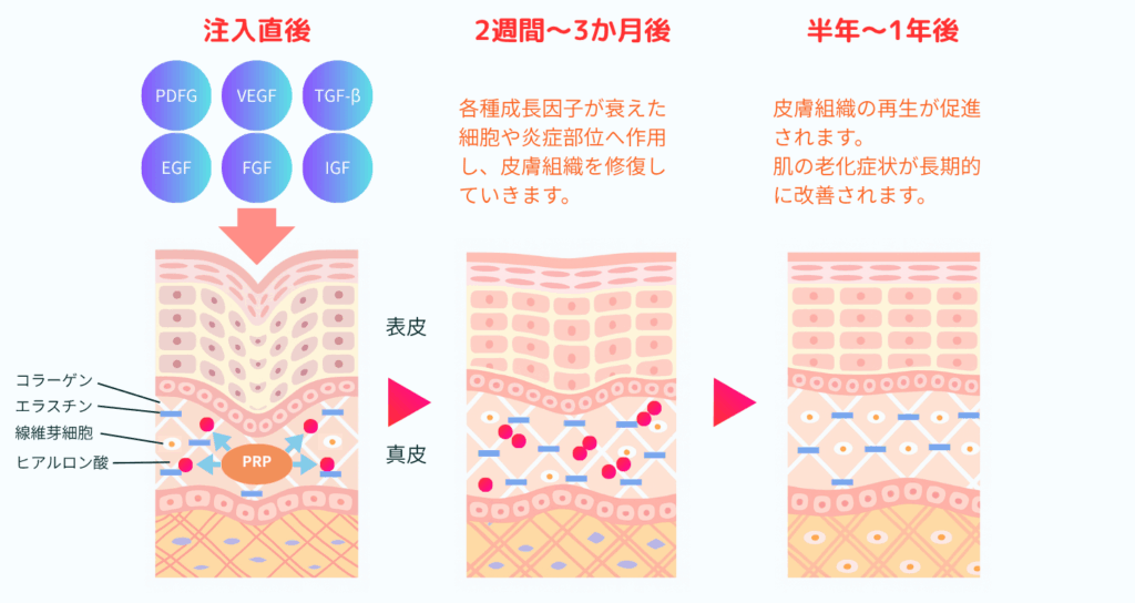 | PRP(Platelet-Rich Plasma)とは、「多血小板血漿」と呼ばれる再生医療技術のひとつで、患者様ご自身の血液から血小板を高濃度に抽出し、その中に含まれる成長因子を利用して肌や組織を再生させる治療法です。血小板は、傷の治癒や組織修復を行う働きを持つ細胞。その血小板から放出される【成長因子(グロースファクター)】には、肌の細胞分裂を促し、コラーゲンやエラスチンの生成を活性化させる作用があります。つまりPRP療法は、自分の再生力そのものを引き出すナチュラルな若返り治療です。 | |||||||||