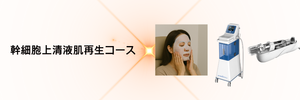 | 臍帯由来の幹細胞上清液を水光注射によって、肌全体へ幹細胞上清液を皮膚の真皮層にムラなく注入します。「細胞が若く健康な頃に分泌していた再生信号」を再現するもの。衰えた肌細胞に再生のメッセージを送り、細胞レベルで若返りを誘導するエイジングコースです。 | |||||||||
